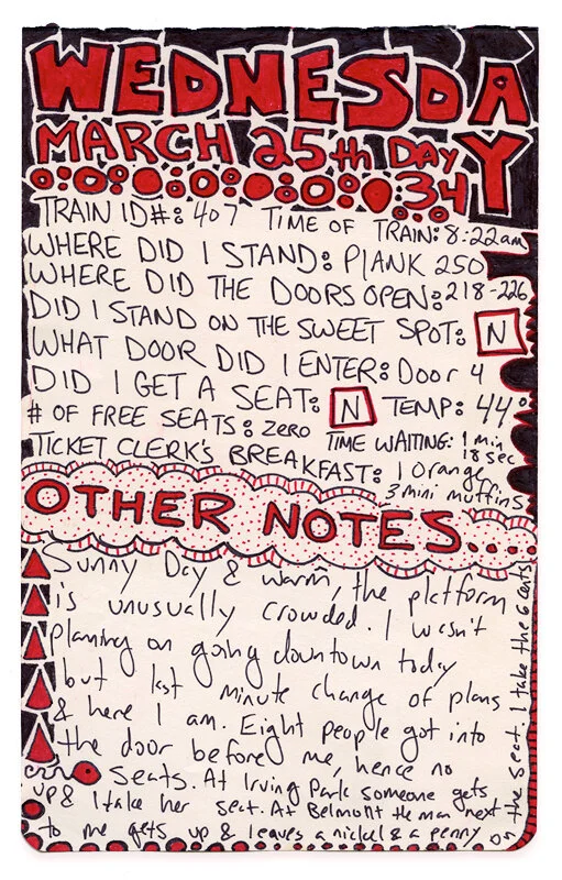 The data that was used to construct the diagram was based off fifty daily notes (one for each day of my study). Each note is 8” x 5” and documents my location on the platform, where the train doors stopped, the temperature, as well as possible variables such as the ticket taker’s breakfast and the amount of time I waited for the train to arrive. Click HERE to read an article about these notes written by Logan Zelk for the Yale Daily News.