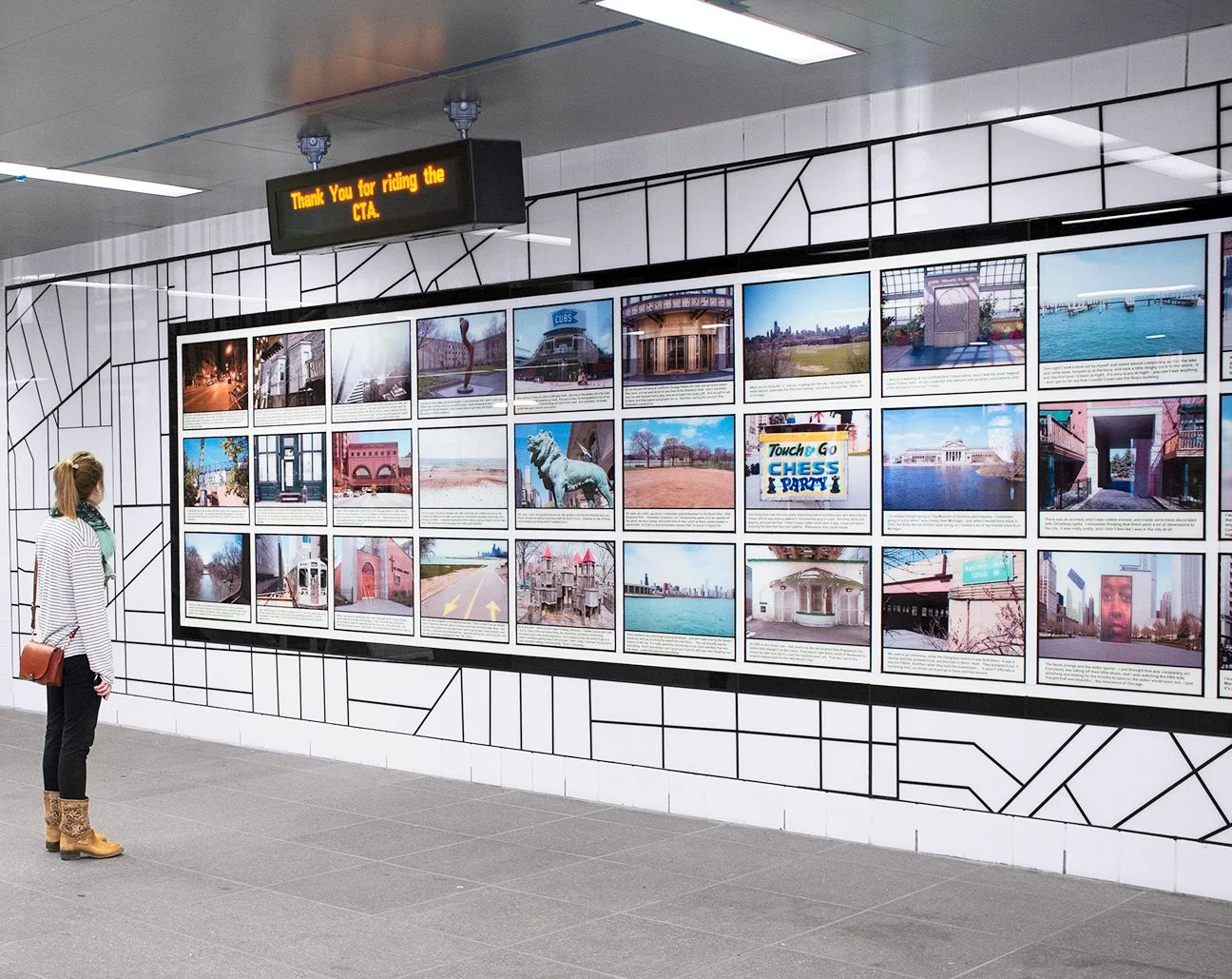 The finished piece is titled Chicago El Stories and consists of forty-two 20'' x 24'' photographs paired with quotes from the interviews, each mounted behind a glass tile. The black and white tiles surrounding the photographs depict a street map of the neighborhood surrounding the station. The tiles are permanently affixed to the wall of the subway station and have an estimated lifespan of 100 years.